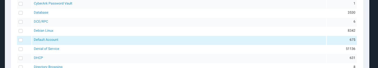 Now that we know about this list of vulnerability categories, let’s focus on my favorite vulnerability category, ‘Default Account’. This category will show all of the vulnerability checks associated with assets that are vulnerable to default account creds. An example of this might be a system running Telnet on port 23 using the username ‘admin’ and the password ‘admin’. This type of vulnerability should be the first thing that is cleaned up in your vulnerability management program, as they can be exploited with near zero hacking experience.