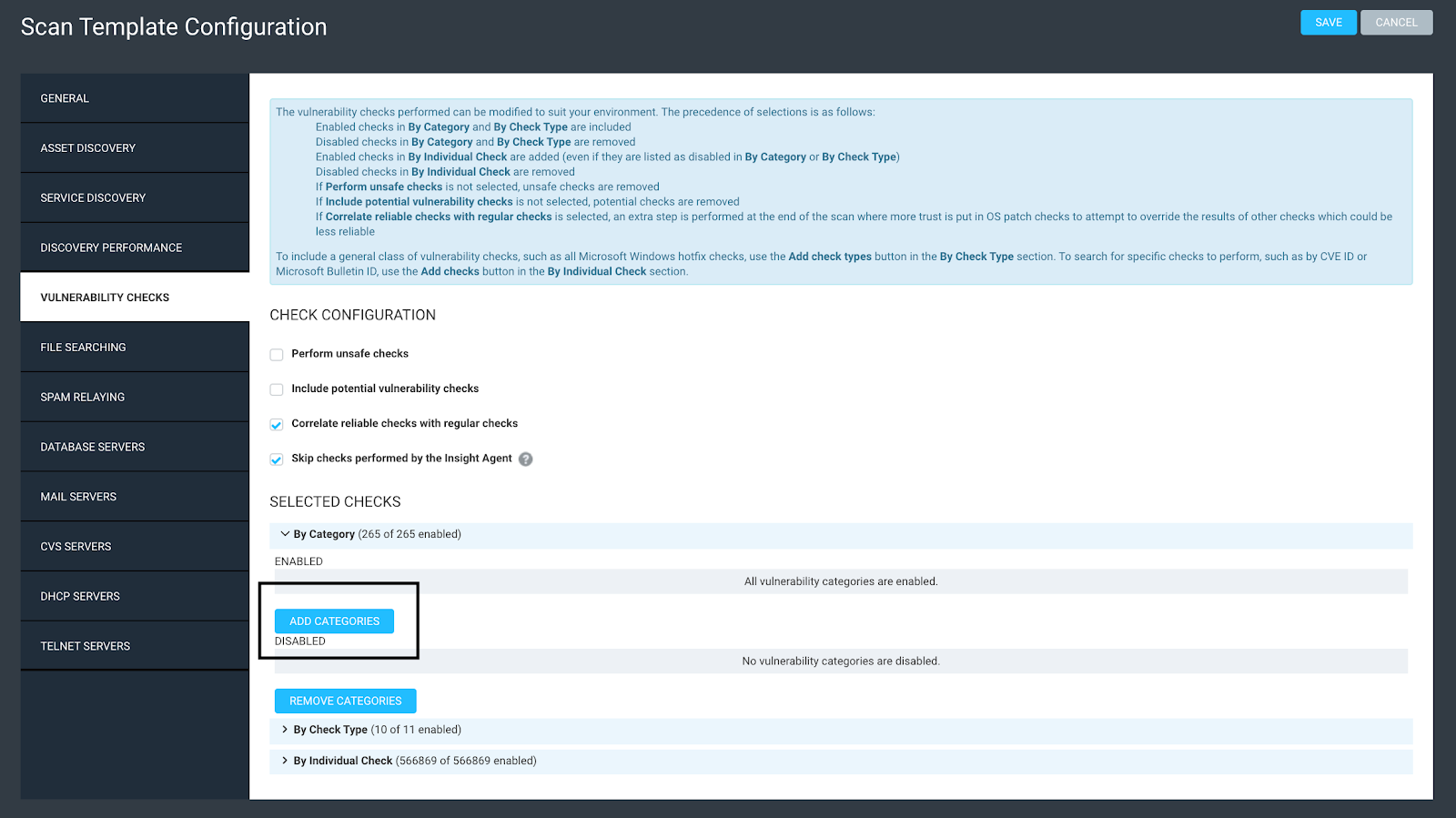 Navigate to the Vulnerability Check Tab on the Scan Template and click on ‘Add Categories’