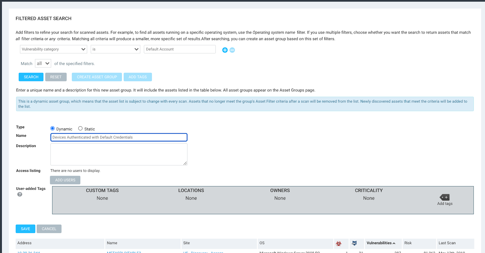 Create Dynamic Asset Group with ‘Vulnerability Category IS Default Account’: