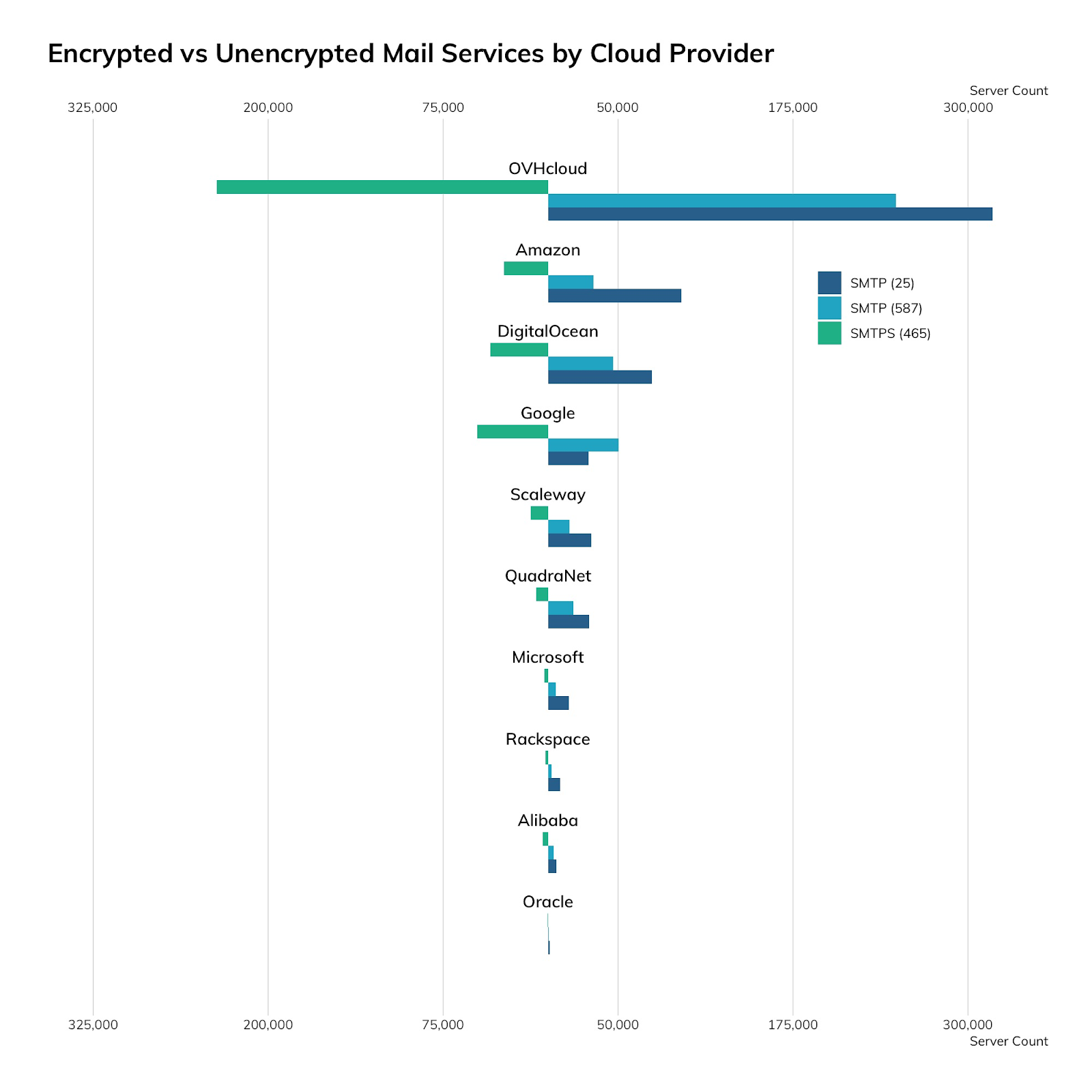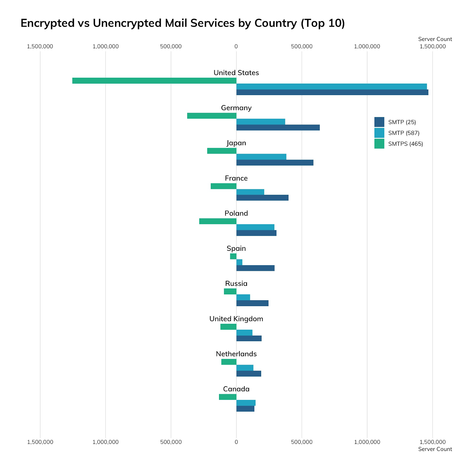 While SMTP is traditionally cleartext with an optional secure protocol negotiation called STARTTLS, we're seeing more SSL-wrapped SMTP, also known as SMTPS, in the world today. The following charts and tables illustrate the distribution of SMTP over port 25, SMTP on port 587 (which is intended for SMTP-to-SMTP relaying of messages), and SMTPS on port 465.