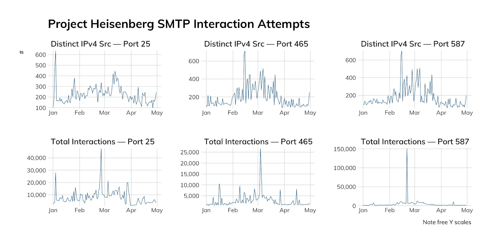 Given the high value attackers tend to assign to SMTP vulnerabilities, it’s no surprise that we see fairly consistent scanning action among threat actors in our SMTP honeypots.