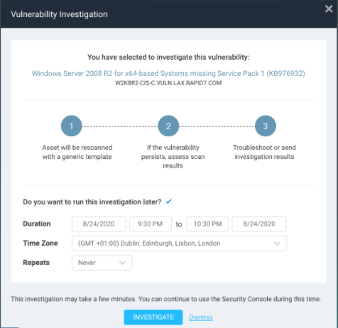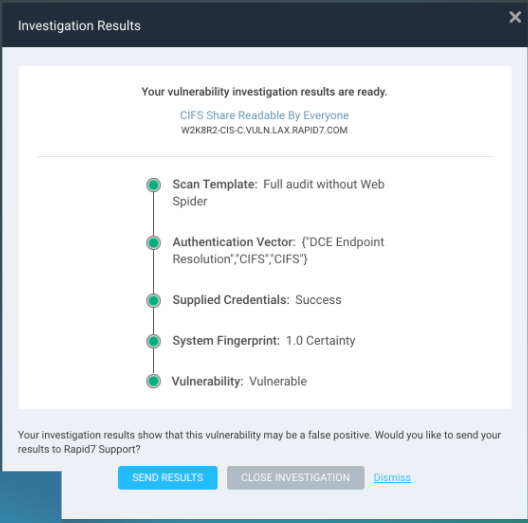 InsightVM allows you to investigate vulnerable results as potential false positives directly from the Security Console. If your investigation shows that the result could be a false positive, you can report the findings to the Rapid7 Support team in a single mouse-click.