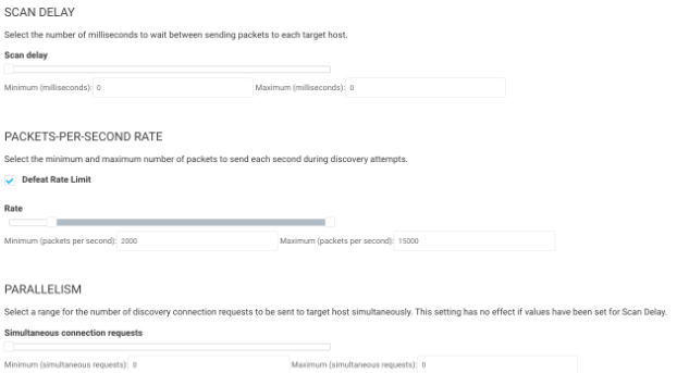 The minimum packets per second section is the primary way to make the Discovery part of the scan run fast, at the cost of bandwidth. With TCP being designed in the 1970s back when networks were extremely small, it was designed to always slow down rates to the minimum, so increasing the minimum will force the network to use more bandwidth and run the scan faster. The default of 450 packets per second, with an average packet size of 1,500, means you are using around 600kB/s of bandwidth for your scan. This is not an issue unless you are running on an old ISDN or DSL WAN connection. Most WAN links today are usually 100MB/s plus, so this number can be gradually increased to speed up the scan. I generally recommend trying 2,000, and work with your network team to ensure they don’t notice any impact and maybe go a little bigger.