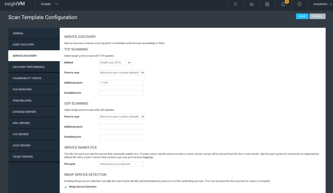 I recommend leaving everything default in this section, especially when doing unauthenticated scans where the goal is to get an overall view of the network. The service discovery could also be called port discovery, and by default, we use SYN>ACK, which is very solid, stealthy and lightweight. The “Well Known Port Numbers” also tend to be good enough. For authenticated scans, where you just want to run patch checks, you can get much better performance by limiting to the ports known to be used with any credentials provided in the site configuration.
