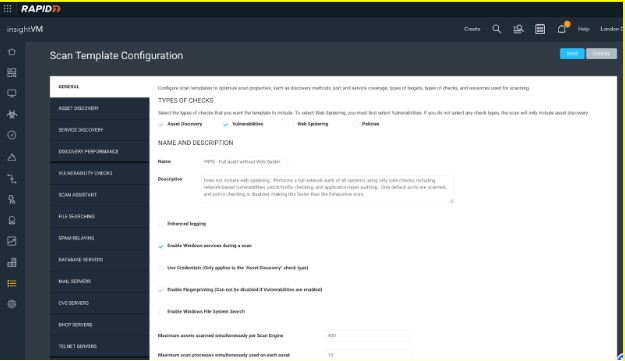 Maximum assets scanned simultaneously per Scan Engine: This is where some math comes in, as it is variable depending on whether you're using the local engine, the OS being used, whether you're using a dedicated scan engine, and the memory and CPU levels. It is arguably the most important option in the scan template, as it controls how fast you can scan, and the default of 10 is very low based on current best practices and needs to be updated.