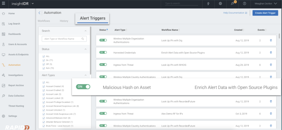 InsightIDR, Rapid7’s cloud SIEM, ingests and analyzes critical security data from across an organization’s environment—including user activity, logs, cloud, endpoints, and network traffic—into a single solution. Then, with its expert-driven detections and automation, it enables security teams to respond to attacks in a fraction of the time. Using pre-built automation workflows, customers can take actions like containing threats on an endpoint, suspending user accounts, or integrating with ticketing systems, all from within InsightIDR.