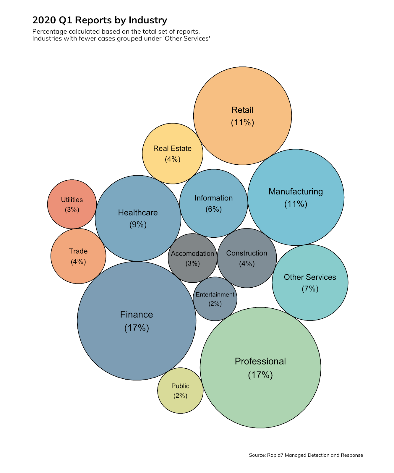 In 96% of Rapid7’s findings, a stolen credential was the cause of an incident. The top four industries affected by stolen credentials were: