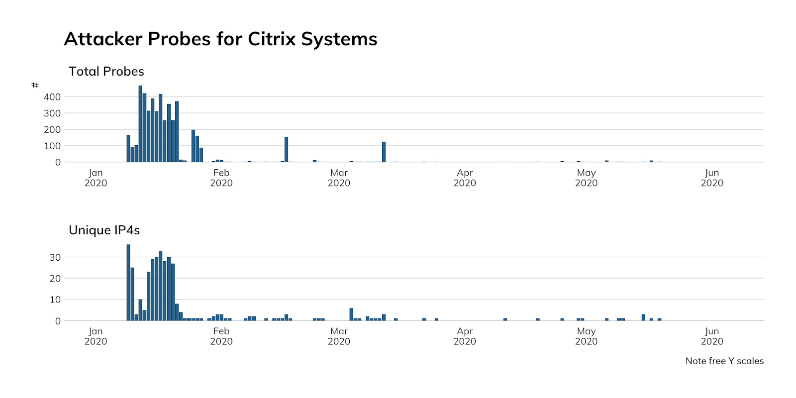 Our honeypots do not emulate Citrix, so the lack of activity is more likely due to our nodes being ignored after each attacker inventory scan. Attackers may also be reusing initial inventory lists or have already established a foothold on the thousands of systems that took forever to be patched.