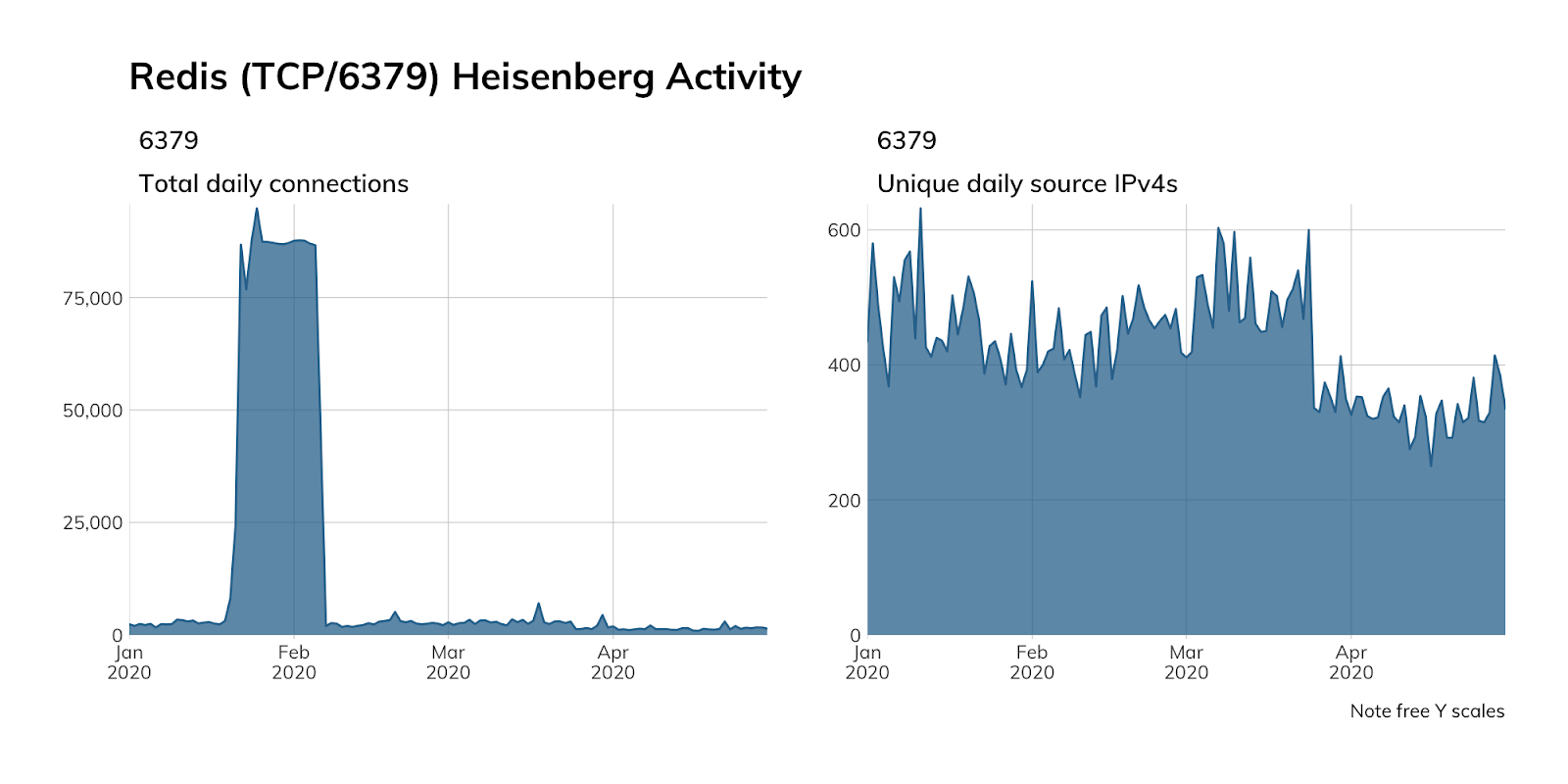 Project Heisenberg does not emulate Redis, but we can use attempted TCP connections to port 6379 as an initial, imperfect proxy to see whether attackers are, indeed, scouring the internet for exposed Redis nodes.