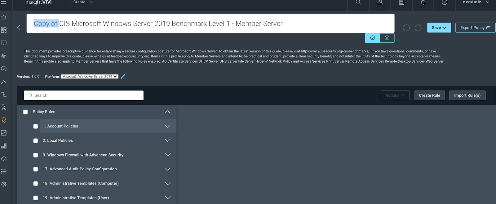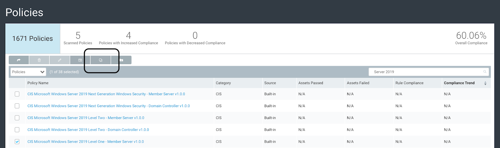 In the InsightVM console, you will see the Policies link on the left menu. After clicking on it, search for “Server 2019” in the upper right, find the policy you want to copy, select it, and hit the copy button at the top of the screen.