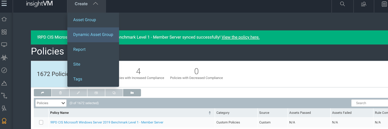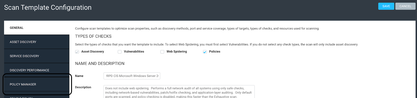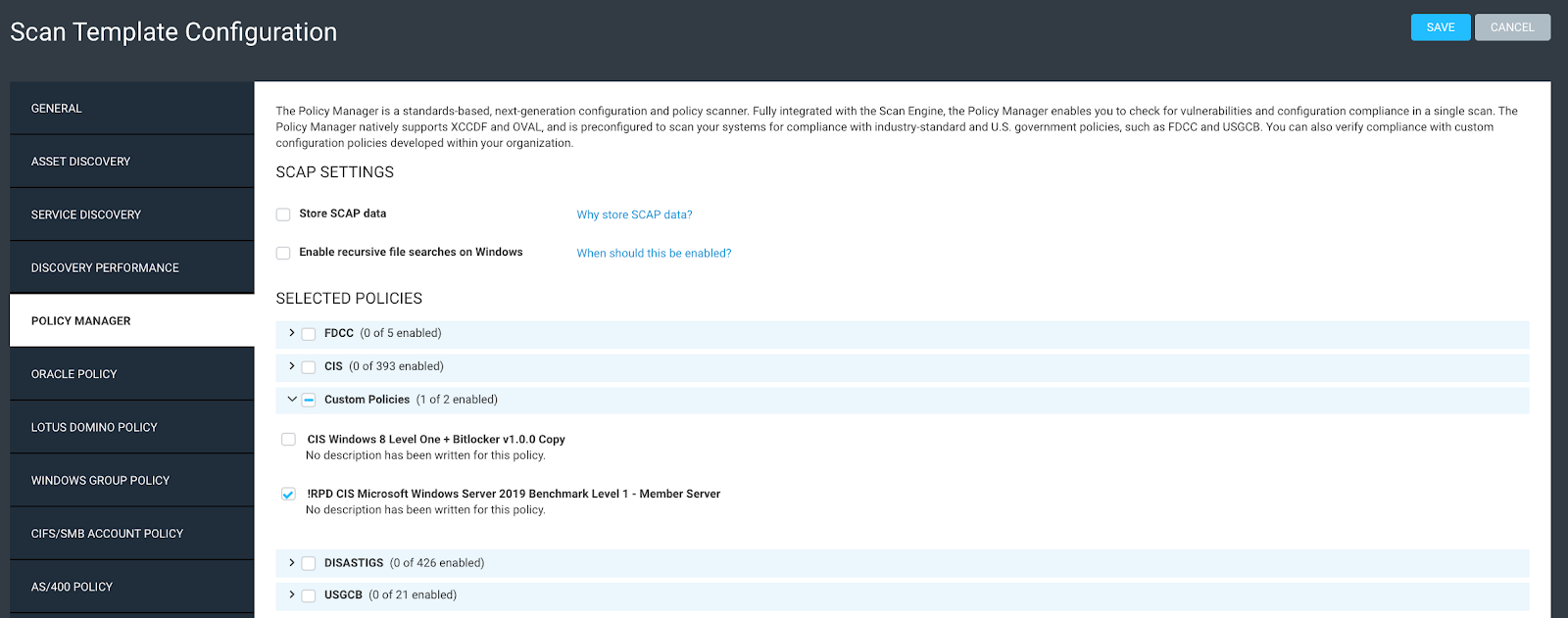 Note: When we talk about policy scanning in InsightVM, we are talking about system hardening guidelines generally from the Center for Internet Security (CIS). We also include FDCC, DISASTIGS, USGCB, and custom upload options.