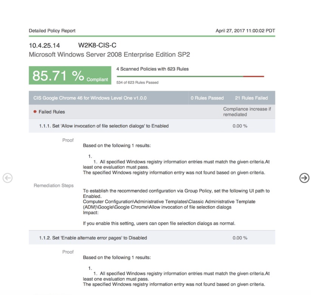 First, this report is highly detailed so I do not recommend running it against a ton of assets, since it’s going to be huge. However, against a single, golden image asset, it can be amazing. One could literally walk through this report and harden a box. It will still not be an easy challenge (even for a single asset I’ve seen this report exceed 400 pages). But I like it because it has the proof (to show why we found this finding) and the remediation steps for every rule being tested for the asset in question. This is basically the report I recommend sending to remediation folks. For higher-level understanding and reporting, I highly recommend using the UI options in the policy tab, as they can be very insightful and complete!