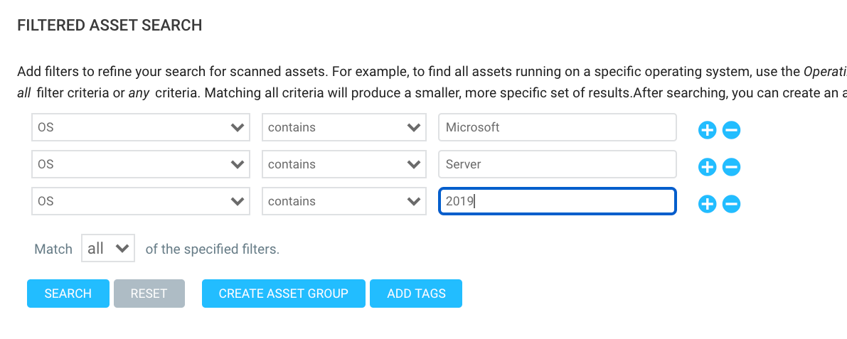 Now that we have our custom policy template ready to go, the next step is to find one or many Windows Server 2019 assets. (At this point I am assuming you have already been doing vulnerability scanning and most of your environment's assets are in the database. If they are not, this will not work.)