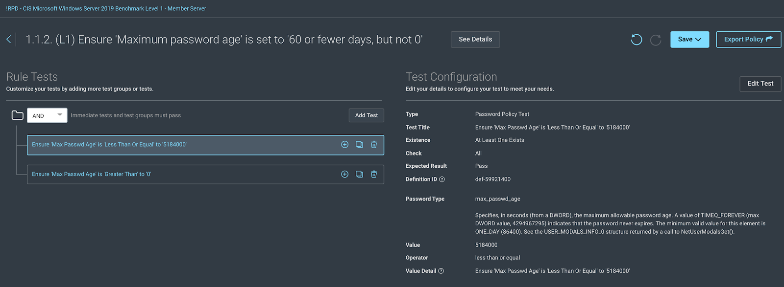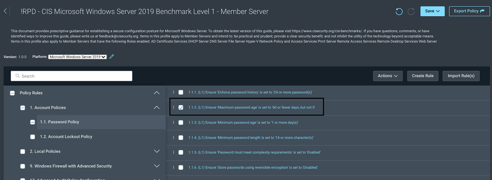 We are going to start things out with the “CIS Microsoft Windows Server 2019 Benchmark Level 1 - Member Server” as an example template. Many companies are going to have some type of Microsoft Server in their environment. The difference between “Level 1” and “Level 2” is that a “Level 1” policy is intended to be more practical without impacting usability, while “Level 2” is designed to provide a “defense-in-depth” hardening and may impact the usability of the server. While most customers lean toward the “Level 1” in the beginning, it’s completely up to you which one you go with.