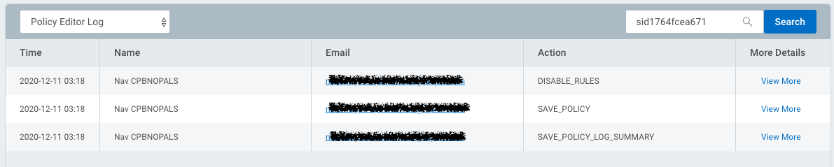 This will open up a new tab, taking the user directly to the platform audit logging table that shows all the custom policy log events. All the actions performed during policy customization are now visible as a list of events, as shown below: