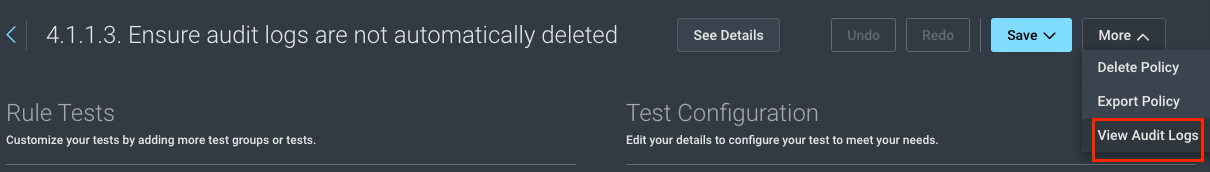 Any user with Admin access to the Insight platform can now navigate to ‘View Audit Logs’ using the ‘More’ dropdown in Custom Policy Builder, as shown below: