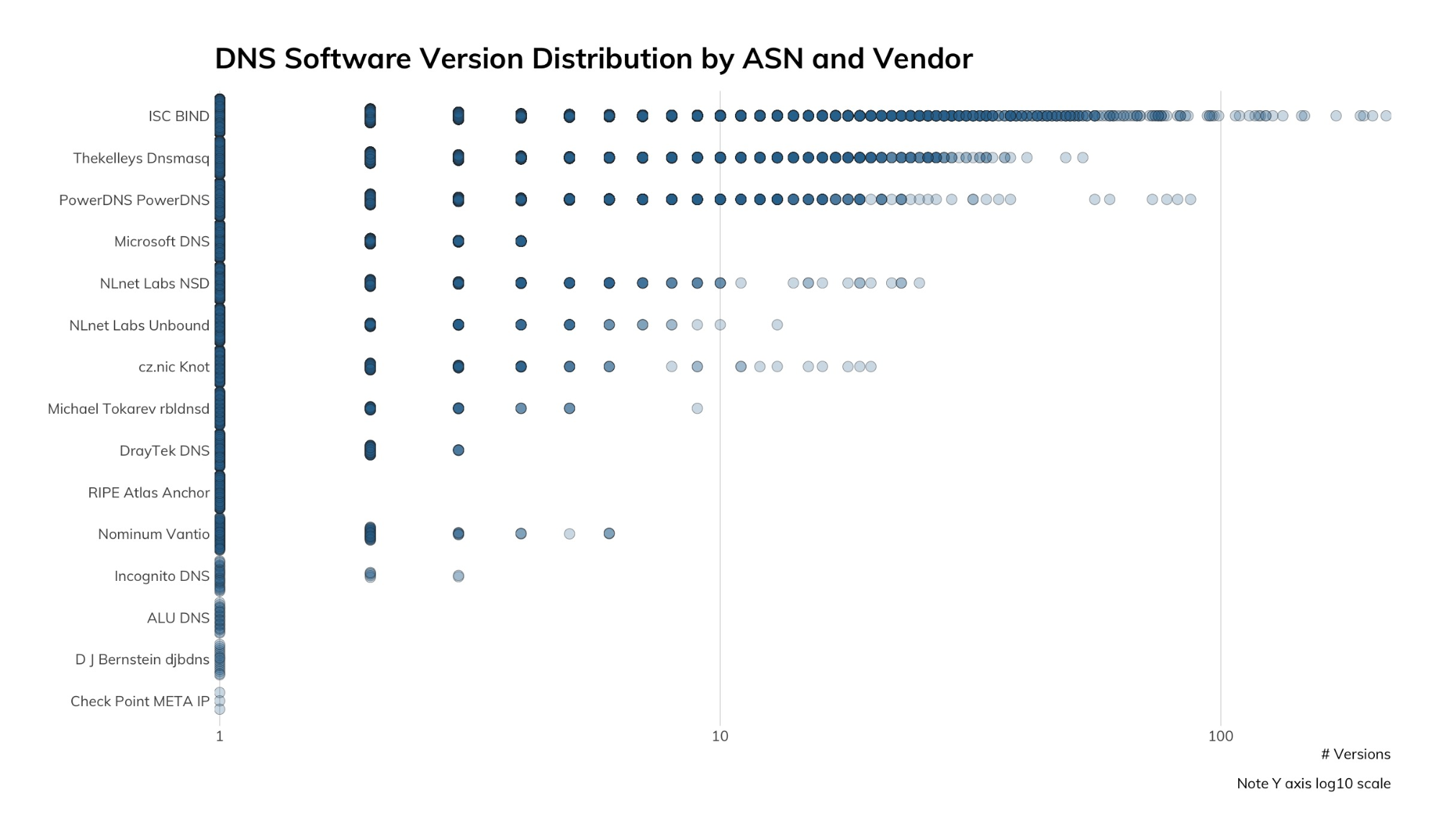BIND (now ISC BIND) was the first DNS server and is still the most prevalent one (of those we had Recog fingerprints for), which is likely why it has 119 CVEs (most all of them DoS-related). The picture really isn’t this clean, though. Within ISC BIND alone, we found 550 distinct version strings (most legit, too). We can look at version diversity by vendor across all autonomous systems with DNS servers to see just how crazy the situation really is: