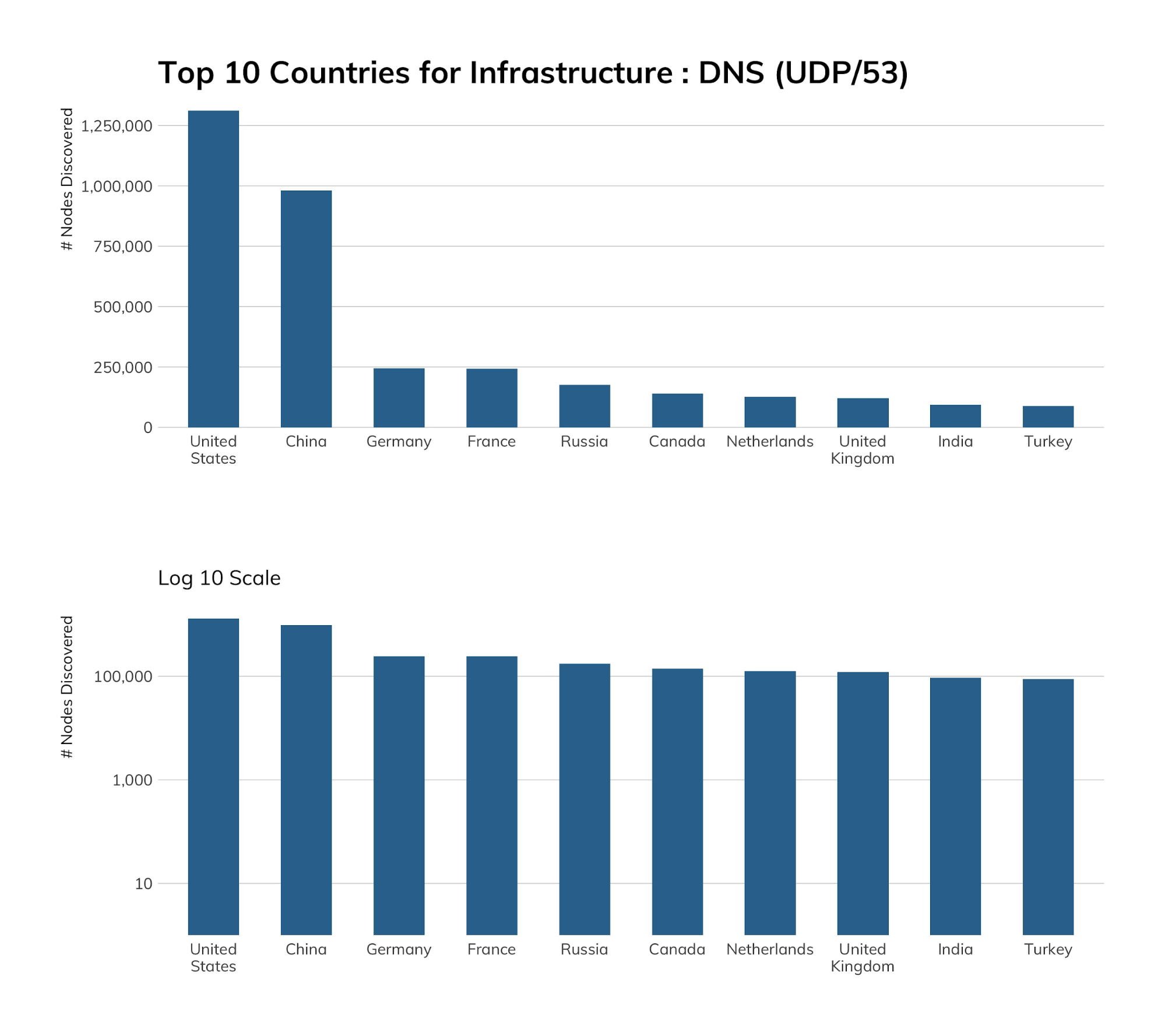 Project Sonar discovered nearly 5 million DNS servers via UDP requests on port 53. This is a far fewer number than the total sum of, say, web servers, but it is a non-trivial number of systems and the reasons for that make sense. ISPs provide DNS services to home and small-business users, organizations host their own DNS to maintain control of their brand namespace, and vendors provide customized DNS services in either an outsourcing capacity or to provide enhanced services such as malware and other types of content filtering. Finally, large technology companies such as Google, Cloudflare, IBM (via Quad9), and others also provide centralized DNS services for various good (?) reasons. This is all to say, outside of the giant centralized DNS providers, the global DNS footprint tends to track very closely with the allocated country IPv4 space; the more IP allocations a given country has, the more DNS servers are there to keep track of them all.