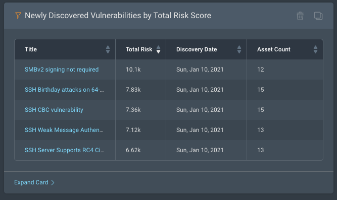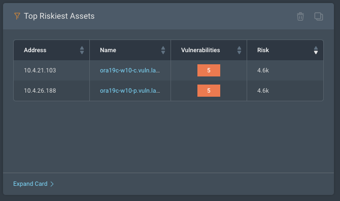 This card lists the riskiest assets discovered in the past 30 days, allowing teams to prioritize remediations that will help reduce risk quickly.