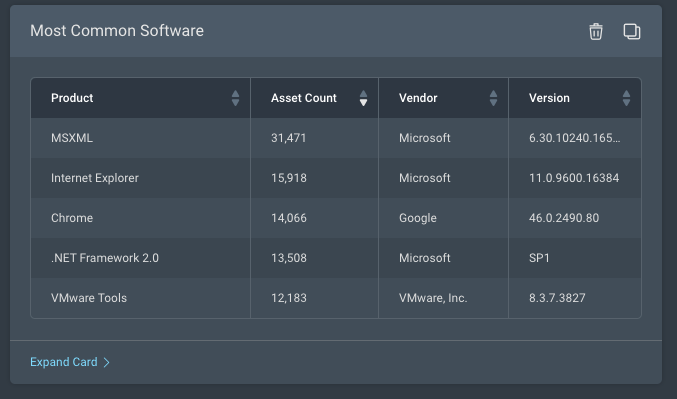 This card shows the software most commonly used in their environment, allowing teams to prioritize their efforts at those items with the greatest surface area.