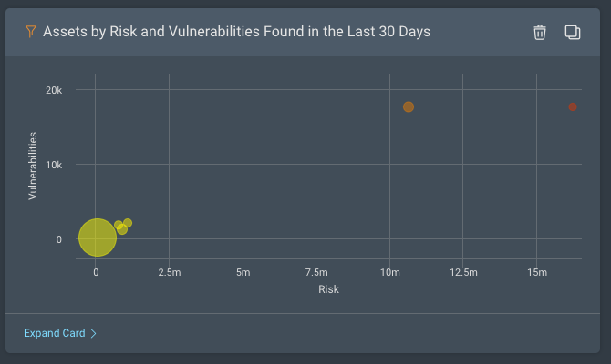 This visualization helps you identify the riskiest assets in your environment based on the number of vulnerabilities and the associated risk score. The size of the bubbles indicates how many assets exist for a given vulnerability count and risk score range.
