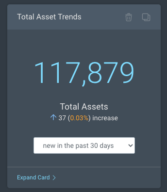 This card shows the total number of assets in your environment, as well as the total number of new assets in the past 30 days and the total percentage of increase.