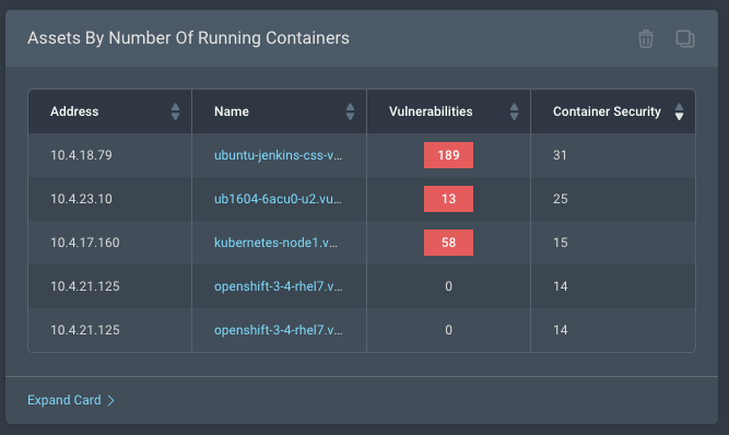 This card is intended to identify risk exposure by showing container hosts and the total number of containers running on these.