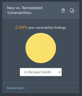 This card shows the number and percentage of new, remediated, and unchanged vulnerability findings. This is powerful in showing which vulns in your environment have been addressed, which are new, and which have remained static.