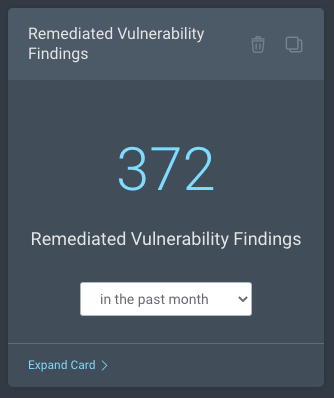 Finally, some positive news. This card demonstrates remediated vulnerabilities in the past 30 days, and this allows teams to demonstrate their progress on a monthly basis.