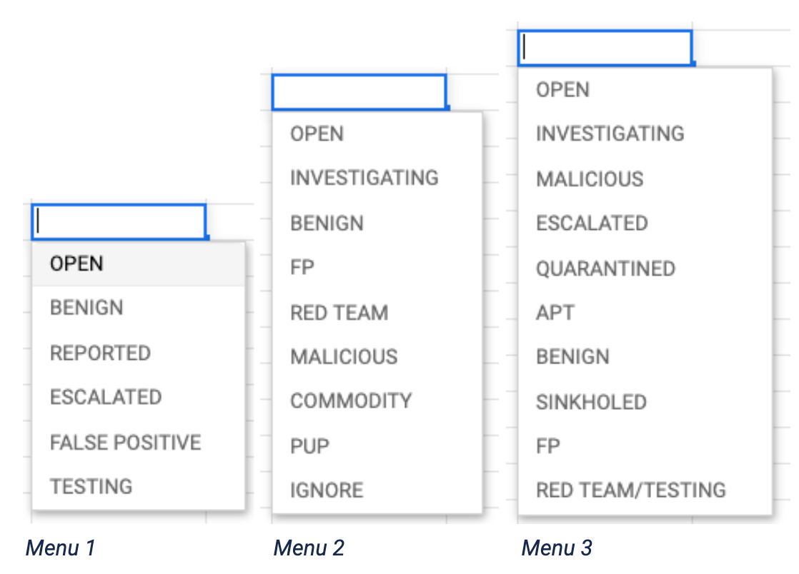 What do these dropdowns all have in common? They are all trying to answer at least two—sometimes three or four—questions with only one drop down menu. Menu 1 has labels that indicate Status and Malice. Menu 2 covers Status, Malice, and Context. Menu 3 is trying to answer all four categories at once.