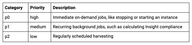 In DivvyCloud, the scheduler is responsible for delegating jobs to the workers. It maintains a job queue in Redis and delegates these jobs to the workers. Jobs fall into three categories: