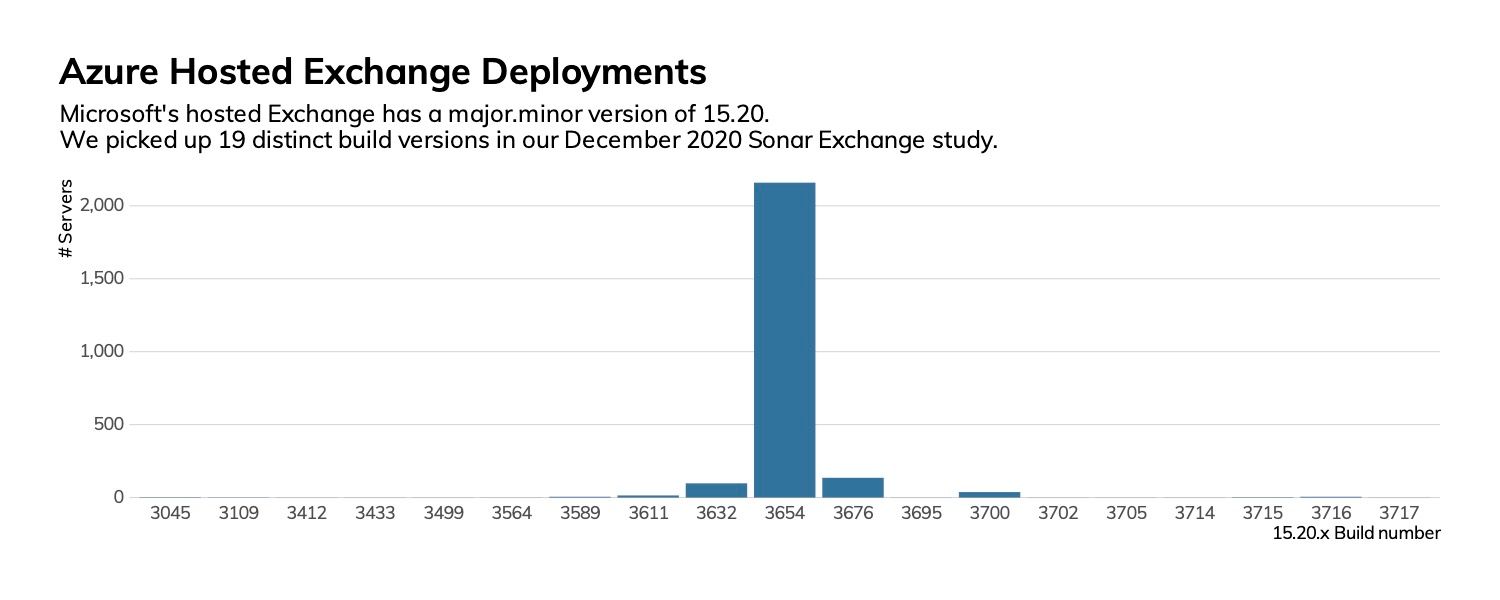 The above figure paints a fairly disturbing picture of the state of Microsoft Exchange in the Fortune 500 in both currency (i.e., age of some server versions) and whether the deployed version is supported by standard Microsoft support contracts. On the plus side, 31% of discovered, precise-version fingerprinted instances are 2020 releases; 72% of these are at a version normally supported by Microsoft.