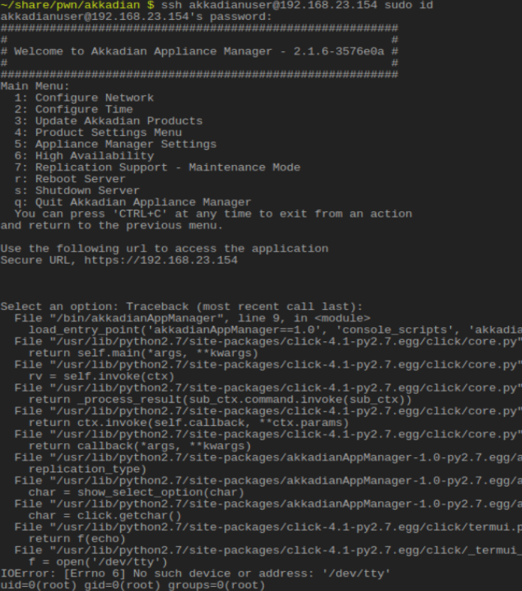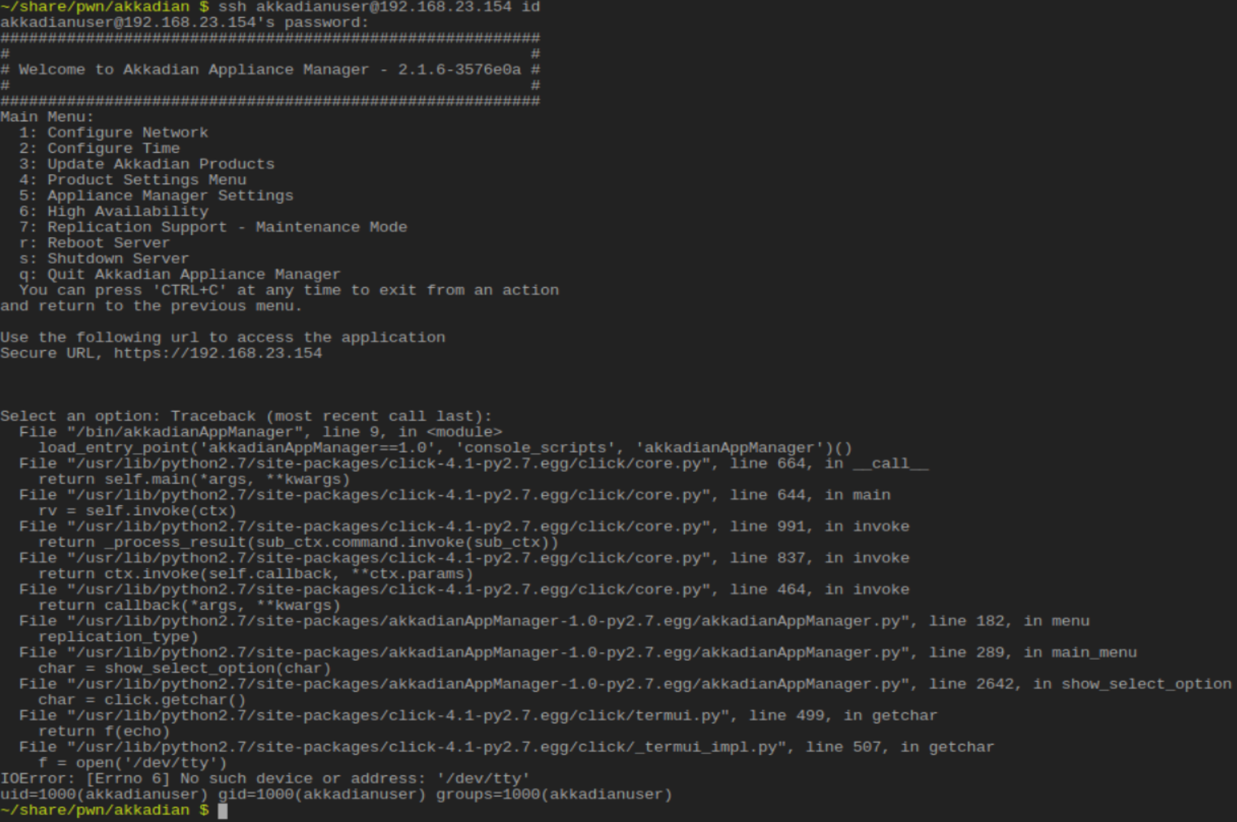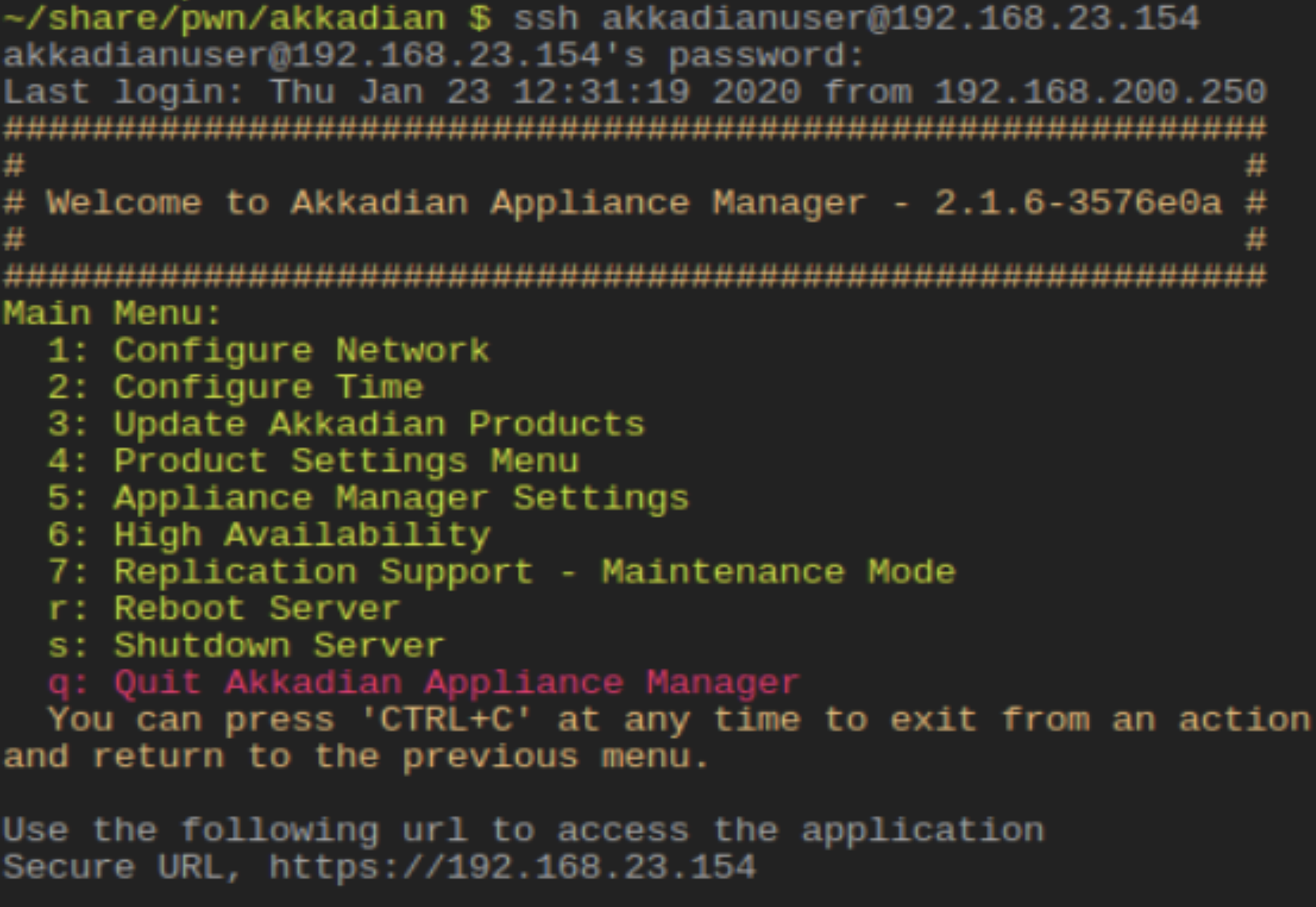 Using the knowledge of the created high availability user password, Rapid7 researchers were able to successfully guess the credential of the existing `hakkadianuser` user, which was `hakkadianpassword`. Rapid7 was able to verify this credential would give access to the Akkadian PME restricted shell: