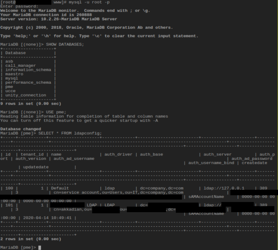 Rapid7 researchers were able to use local shell access in order to successfully validate that these credentials were valid and worked to connect to the underlying MariaDB host listening locally. The scope of the original client's penetration test additionally included an LDAP integrated environment, and this issue was leveraged to successfully recover cleartext LDAP BIND credentials from the database: