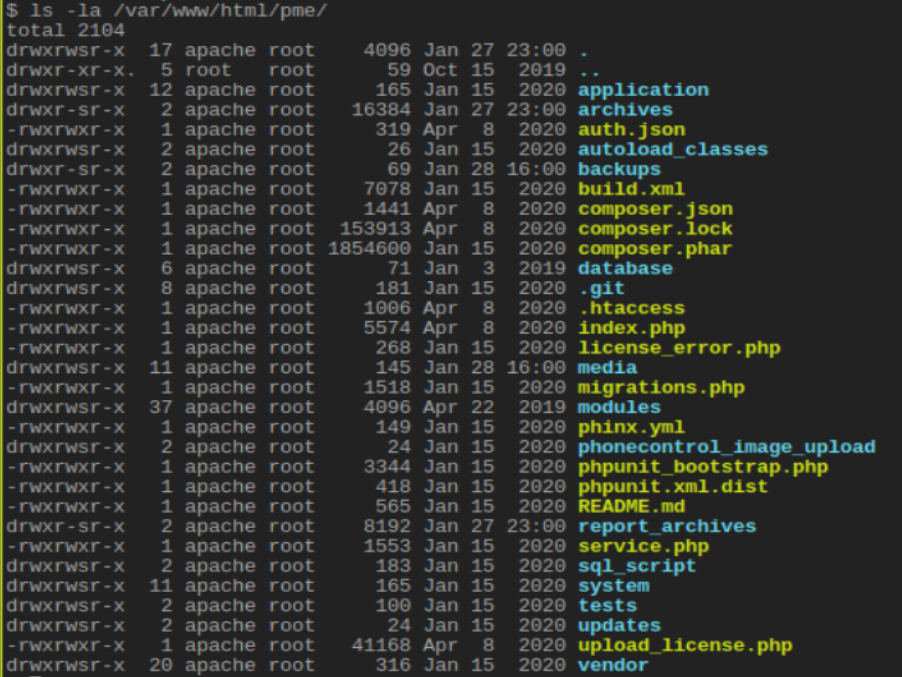 Rapid7 researchers also identified that the application was serving sensitive data via the exposed web server. Listing the `/var/www/html/pme/` directory Rapid7 identified the ionCube packed PHP files, but an additional set of files that were marked with readable permissions: