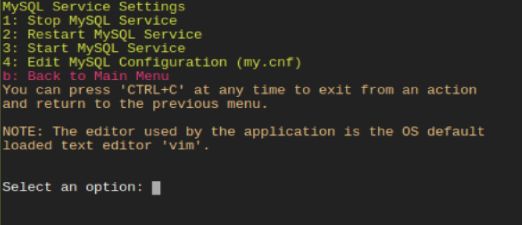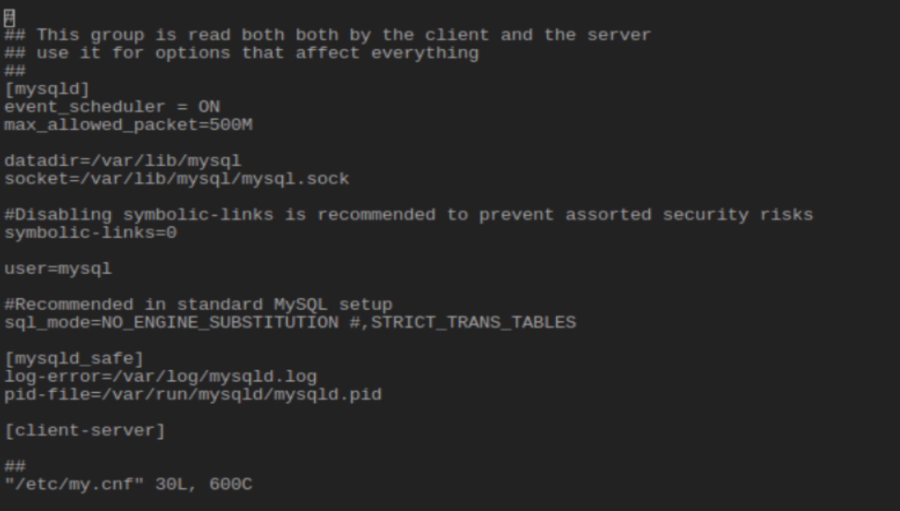Select 4: Edit MySQL Configuration (my.cnf), which finally drops the user into a vi editor interface for `/etc/my.cnf`:
