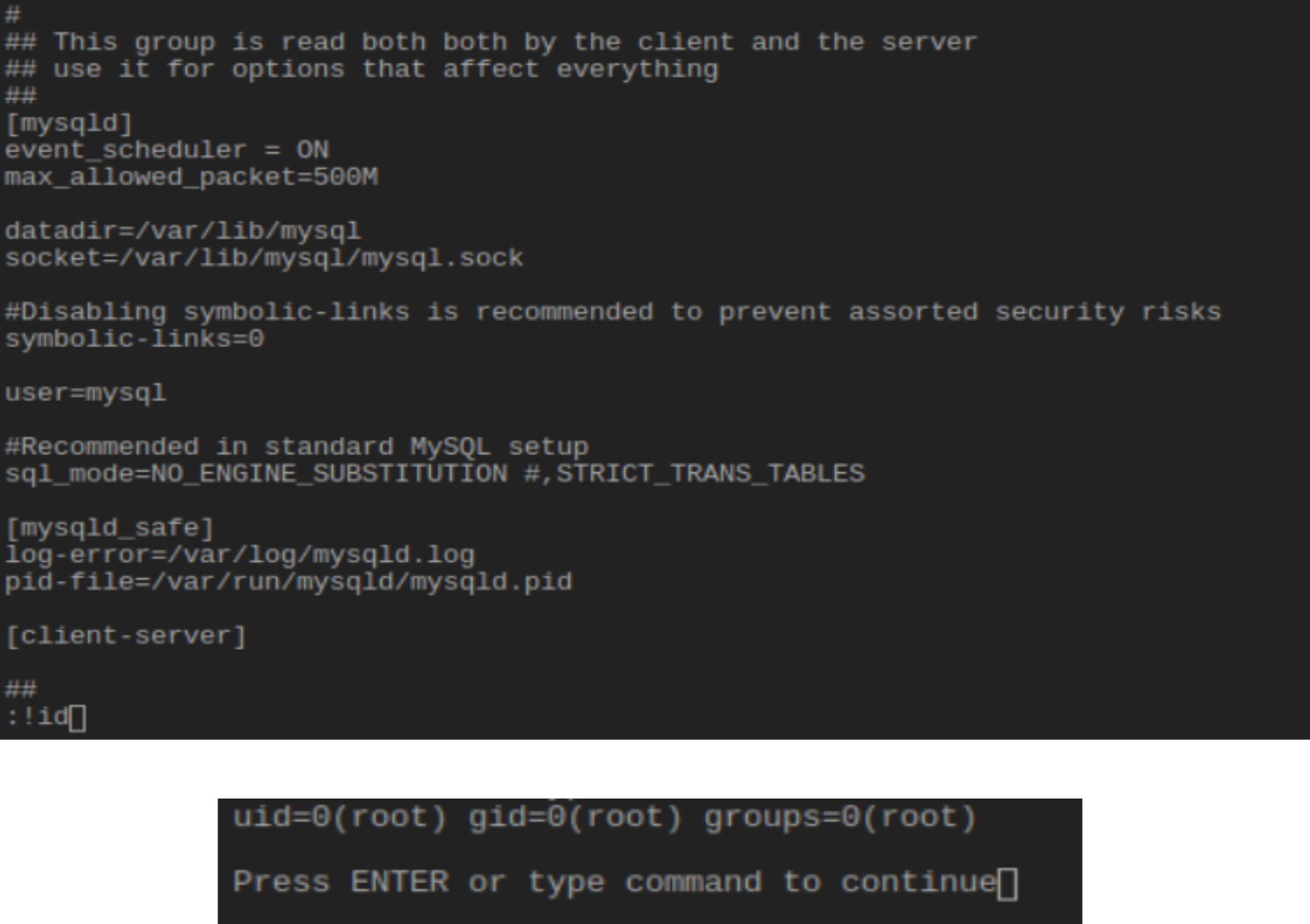 This can be bypassed by using the execution functionality in the shipped version of `vi` on the PME by hitting `:!` and then the desired command. The following screenshot shows that the restricted shell is running as the root user (due to the sudo invocation of the shell as mentioned in CVE-2021-31580):