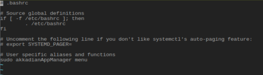 The restricted shell environment is triggered via the /home/akkadianuser/.bashrc configuration file which invokes the `akkadianAppManager` shell via sudo: