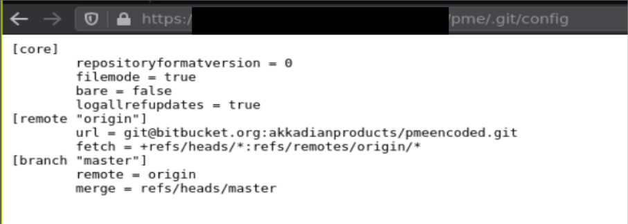 The web server additionally exposed a git repository `.git/` directory. This was verified by visiting `/pme/.git/config` which exposed information about the ionCube packed Akkadian PME repository: