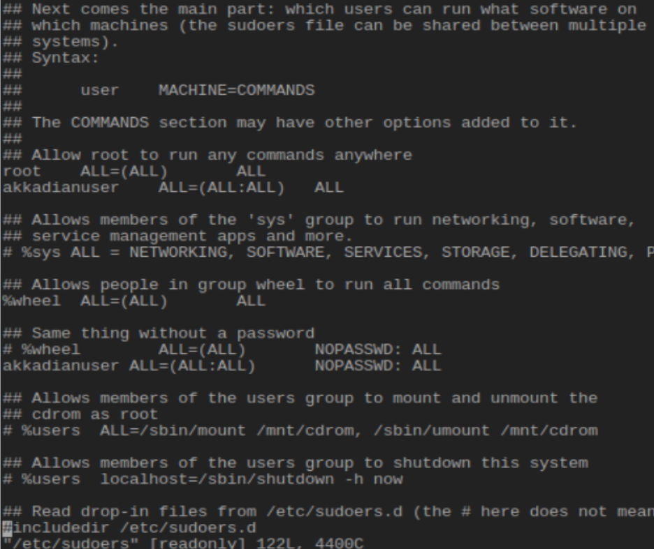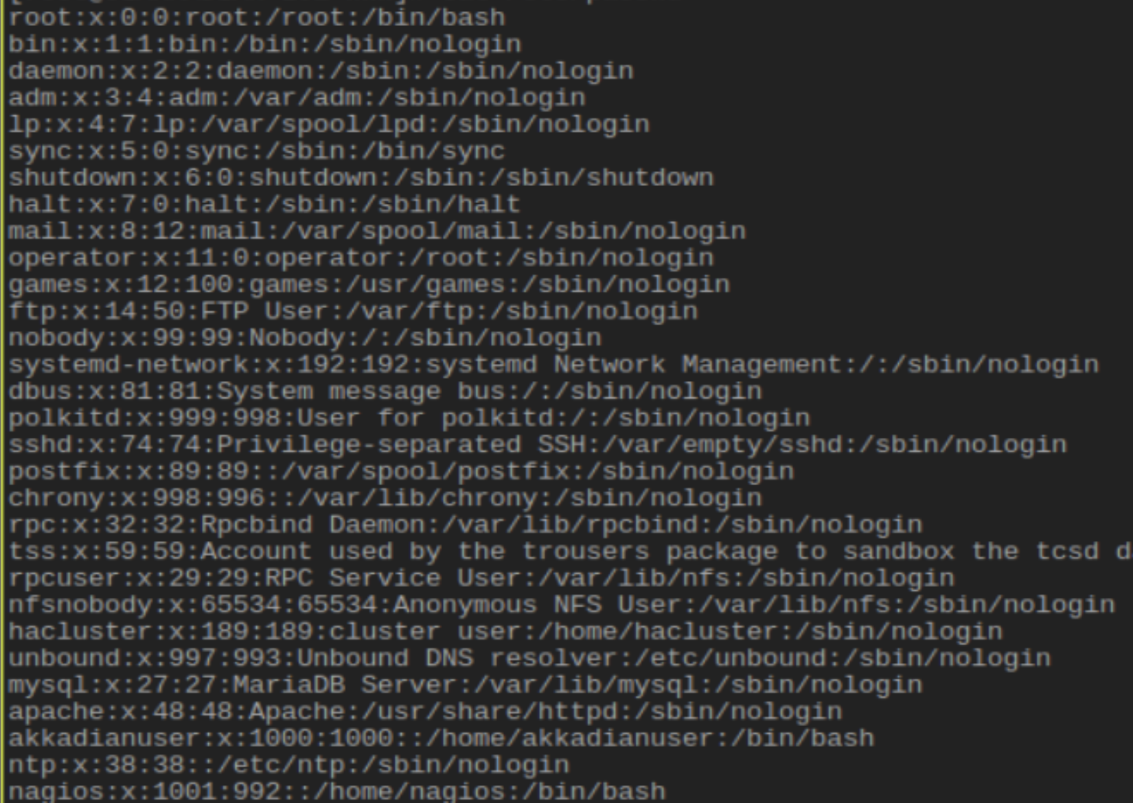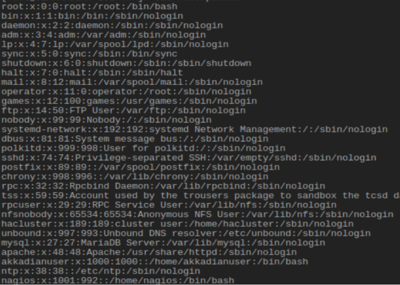 Once shell access was achieved testers identified the enabled `akkadianuser` in the user /etc/passwd database: