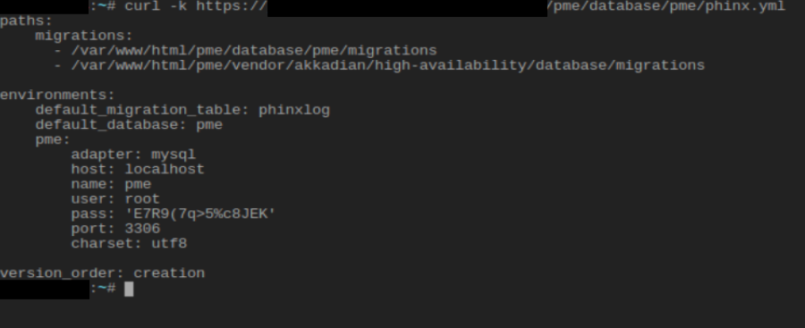 Many of these files contained sensitive data that was accessible via the web server. Of note the `/pme/database/pme/phinx.yml` file contained cleartext local MariaDB usernames and passwords: