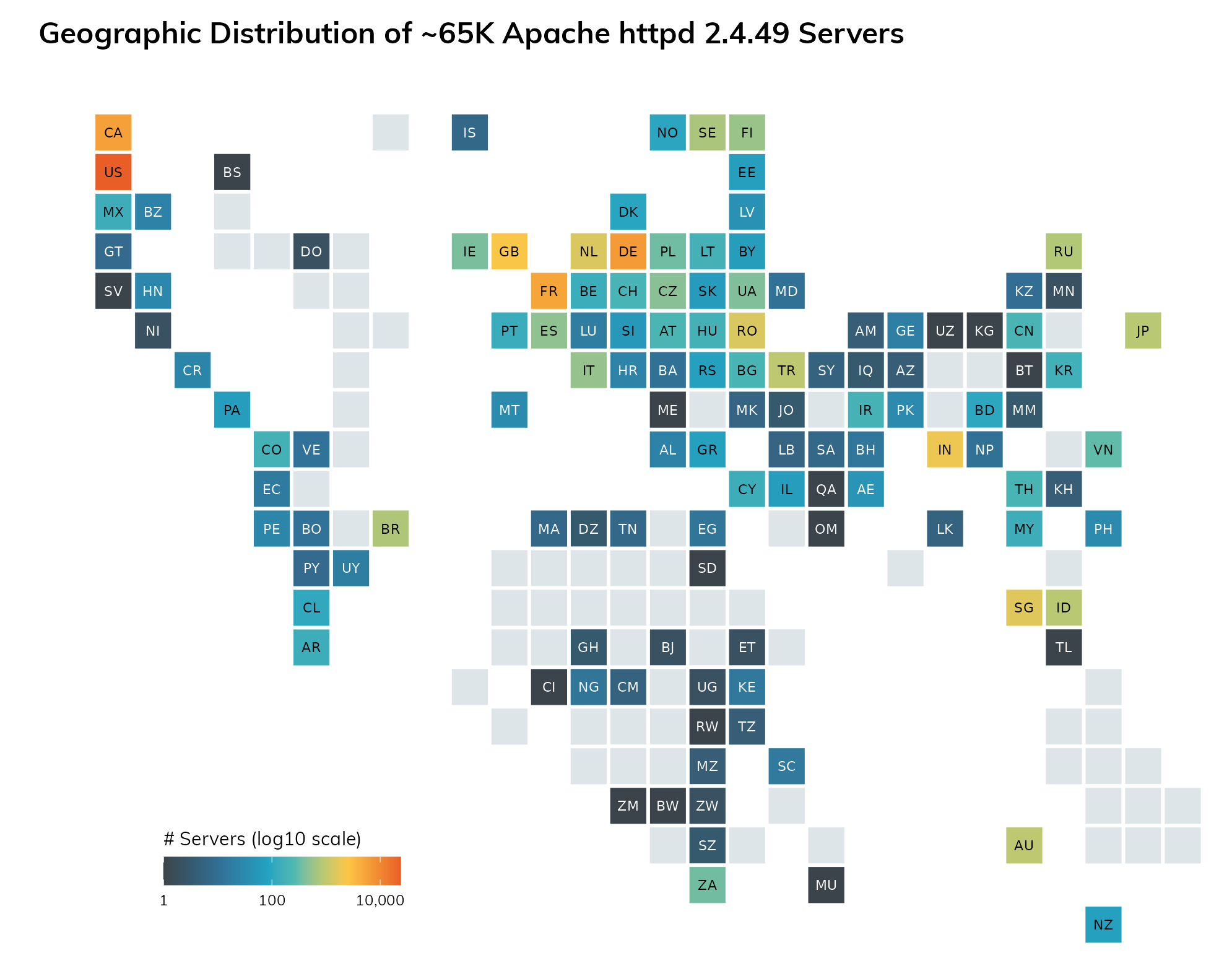 Rapid7 Labs has identified roughly 65,000 potentially vulnerable versions of Apache httpd exposed to the public internet. Our exposure estimate intentionally does not count multiple Apache servers on the same IP as different instances (this would substantially increase the number of exposed instances identified as vulnerable).
