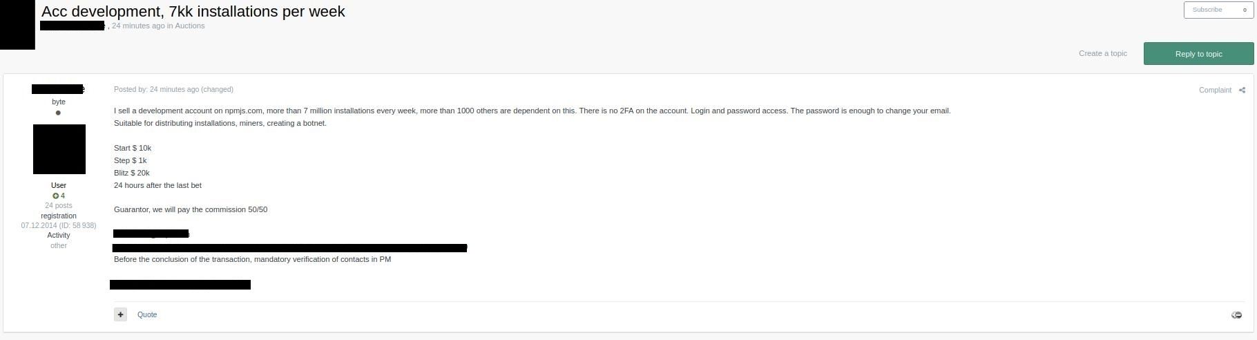 At this time, the source of the attack is unconfirmed. However, with the use of IntSights, recently acquired by Rapid7, a suspicious thread has been identified, created on October 5, 2021, in a prominent Russian hacking forum. There, a threat actor offered access to a developer account of an undisclosed package on npmjs.com, indicating that the package has “more than 7 million installations every week, more than 1,000 others are dependent on this.” With the requested price of $20,000 dollars, the threat actor stated that the account does not have 2-factor authentication.