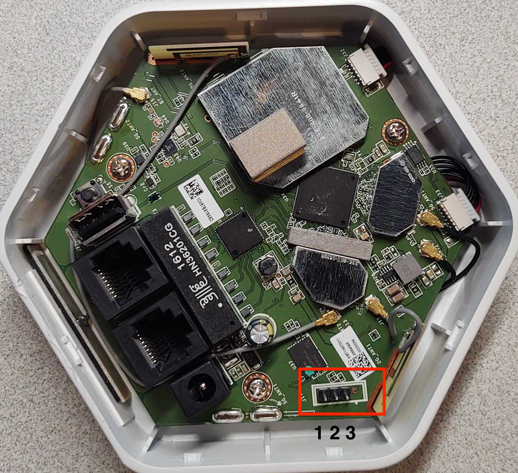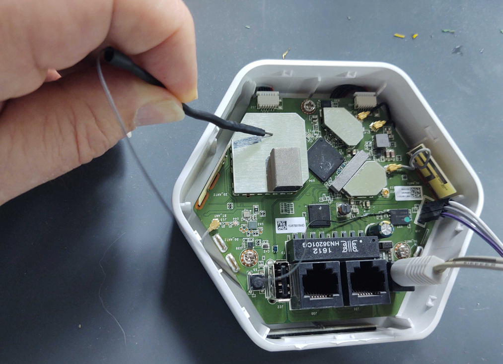 To conduct this “pin glitch" attack to gain access to the U-Boot console, you will need to first power down the device. Then, restart the device by powering it back on while also monitoring the UART Console for the U-boot to start loading. Once you see the U-Boot loading, hold the shorting lead against the metal shielding or some other point of ground within the device, as shown in Figure 12: