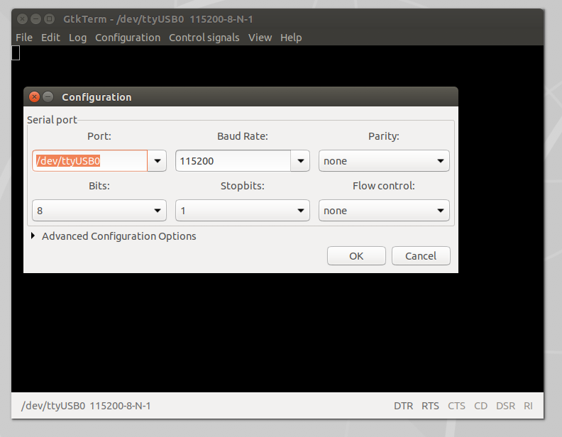 Once the UART to USB device is connected to the LUMA, double-click on the GtkTerm icon located on the Linux Desktop and configure the application by selecting Configuration on the menu bar followed by Port in the drop-down menu. From there, set the Port (/dev/ttyUSB0) and Baud Rate (115200) to match the figure below (Figure 8), and click OK.
