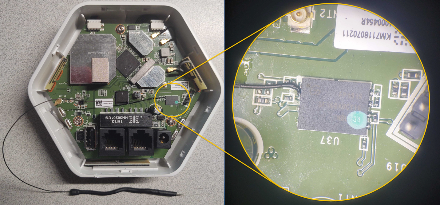 During our live exercises at Defcon IoT Village, to help facilitate the process of grounding the data line Pin 2 Serial Out (SO) — and to avoid ending up with a bunch of dead devices because of accidentally grounding the wrong pins — we attached a lead from pin 2 of the flash memory chip, as shown in Figure 11: