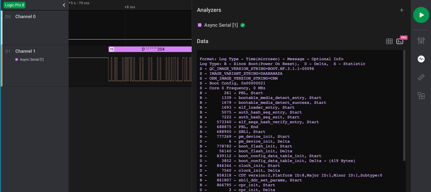Once all the correct settings have been determined, and if the test point is UART, then the decoder in the Logic 2 application should decode the bit stream and reveal console text data for the device booting up. An example of this is shown in Figure 6: