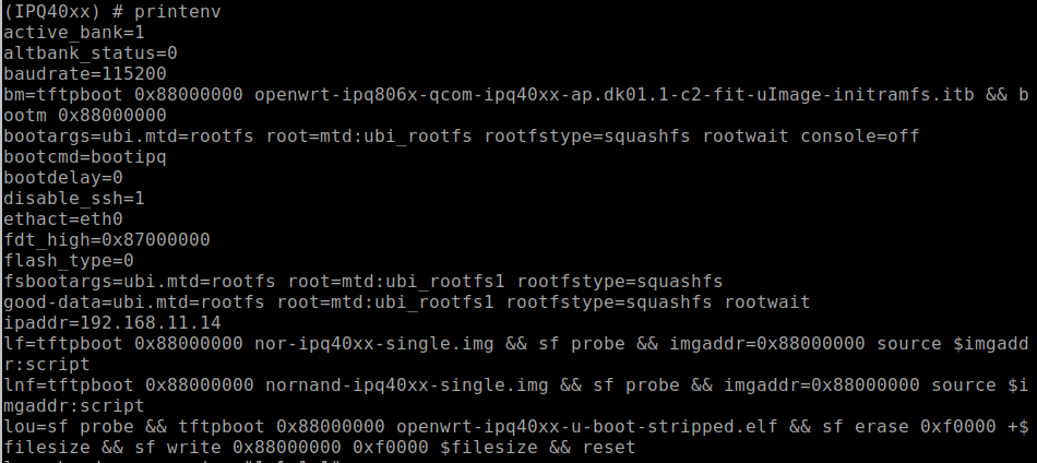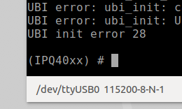 Shorting this or the clock pin to ground will prevent U-Boot from being able to load the kernel. If your timing is accurate, you should be successful and now see U-Boot console prompt IPQ40xx, as shown below in Figure 13. Once you see this prompt, you can lay the shorting lead to the side. If this prompt does not show up, then you will need to repeat this process.
