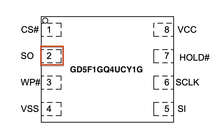 For example, during the boot sequence, it's often possible to force the device to break out of the boot process and to drop into a U-Boot console. For standard U-Boot, this will often happen when the Kernel image is inaccessible, causing the boot process to error out and drop into a U-Boot console prompt. This condition can sometimes be forced by shorting the data line (serial out) from the flash memory chip containing the kernel image to ground during the boot process. This prevents the boot process from loading the kernel into memory. Figure 5 shows a pin-out image of the flash memory chip currently in use on this device. The data out from the flash memory chip is Serial Out (SO) on pin 2.