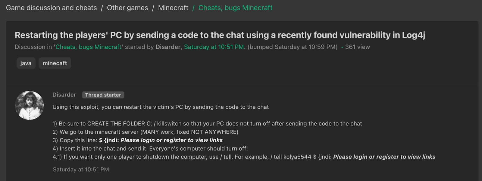 The following two screenshots show that bad actors have already developed and shared proof of concepts exploiting the vulnerability in Log4j. They also show the extent to which this vulnerability impacts user communities such as PC gamers, social media users, Apple/iCloud customers, and more.